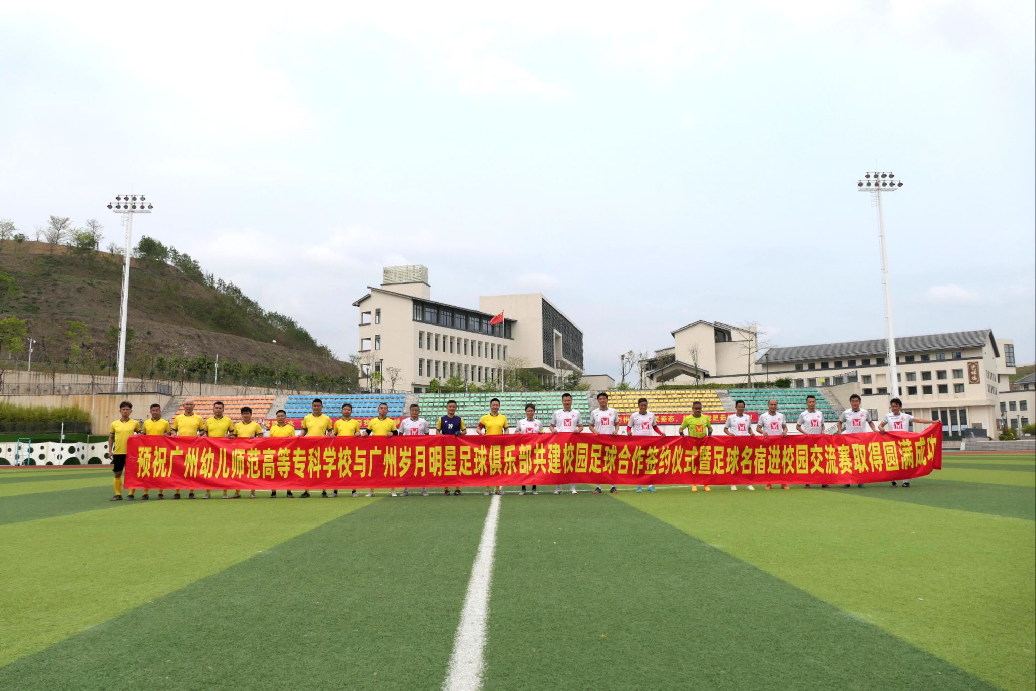 4月11日,彩神8争霸与广州岁月明星足球俱乐部共建校园足球合作签约仪式暨足球名宿进校园交流赛在彩神8争霸科教城校区举行🧑🏽💼。广东省足球协会副主席周穗安,广州市足球协会副主席彭伟国等足球名宿👩🚒,学校党委书记、行政负责人丘毅清🧖🏽♂️,副校长龙辉等领导嘉宾师生出席活动💃🏻🥡。