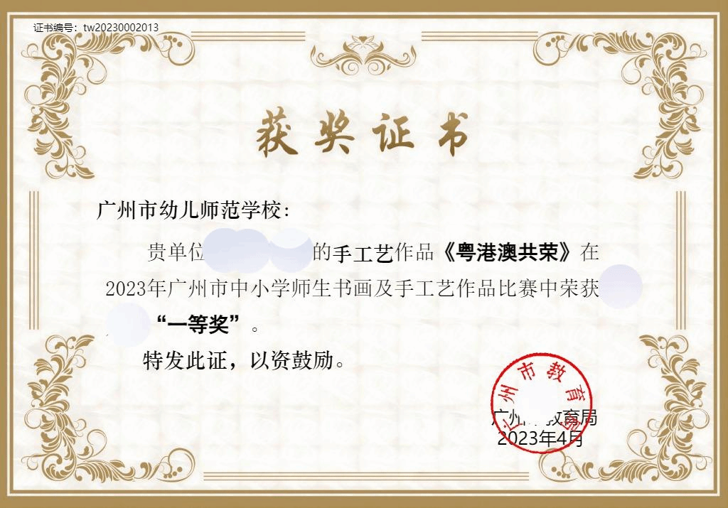 图为广州市中小学师生书画及手工艺作品获奖证书